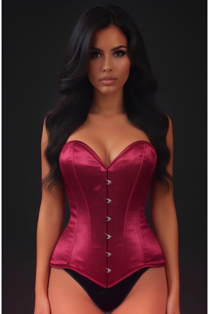 Lavish Dark Red Wine Satin Overbust Corset Sweetheart Neckline Busk Closure - Daisy Corsets