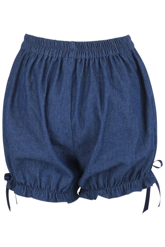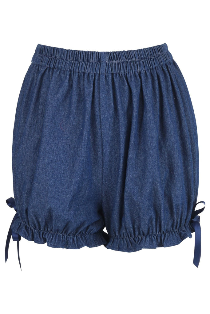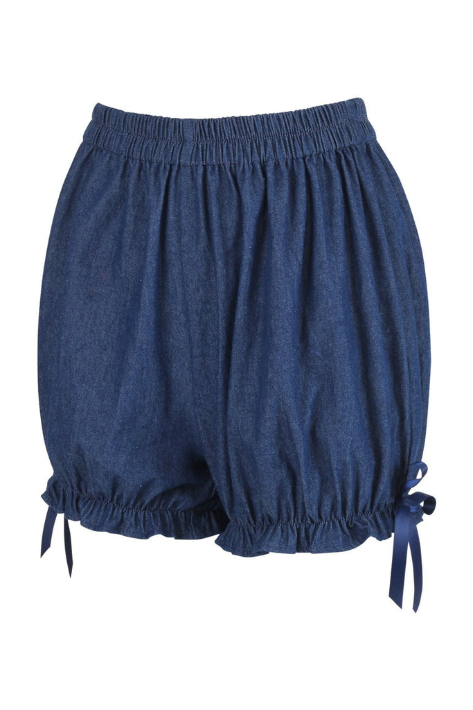 ACC-472-RegularBring a playful vintage touch to your look with these Dark Blue Denim Bloomers! Crafted from soft, lightweight denim, these bloomers combine comfort and style with a gathered silhouette and satin ribbon ties at the legs. The elastic waistband ensures a flattering, flexible fit — perfect for pairing with corsets, western tops, or festival outfits. Whether you’re dressing for costuming, cosplay, or everyday retro fashion, these bloomers are a versatile must-have.