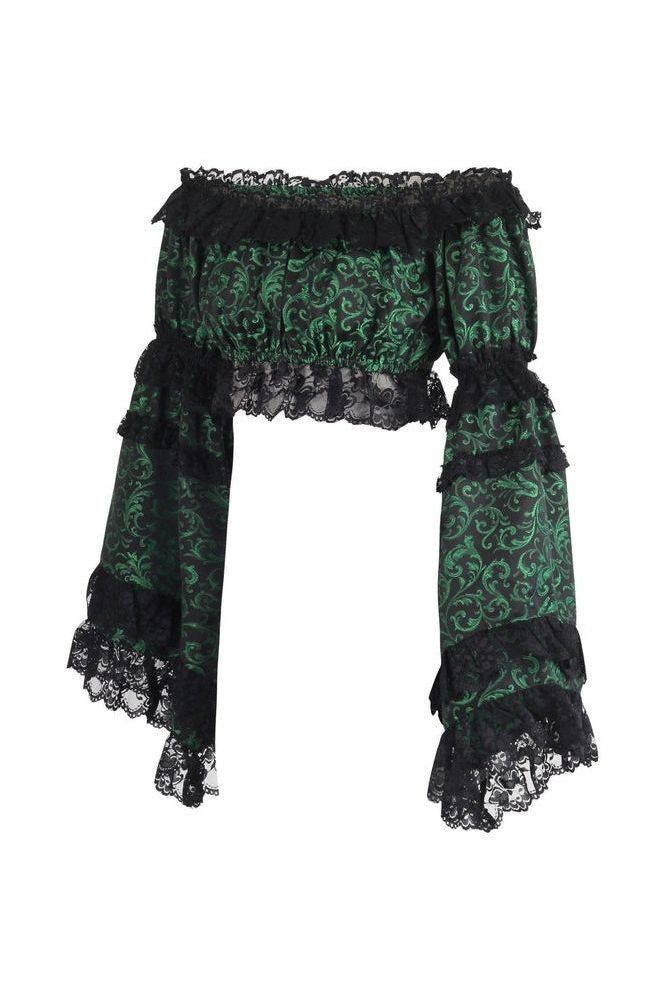 Green/Black Brocade Smocked Flare Sleeve Peasant Top