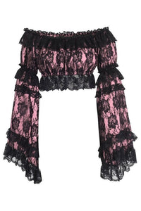 Pink/Black Lace Smocked Flare Sleeve Peasant Top