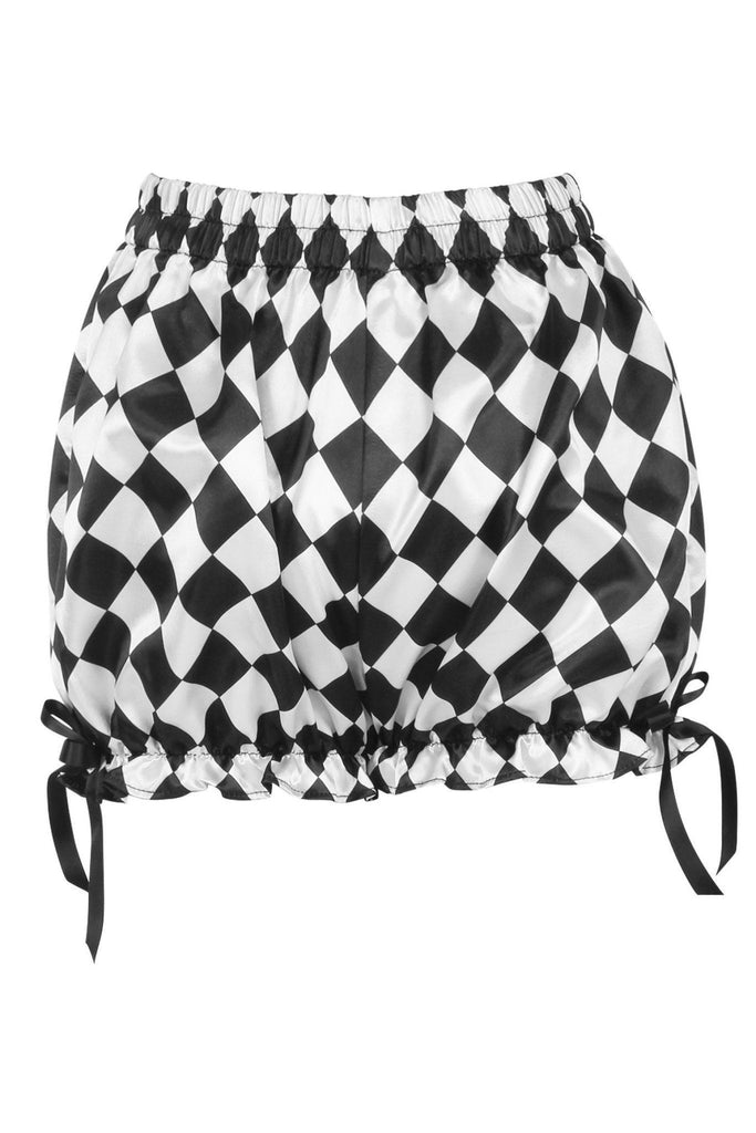 | Bring a playful, theatrical flair to your wardrobe with these Diamond Print Satin Bloomers, designed in a bold black-and-white harlequin check pattern. Crafted from smooth satin, these bloomers offer a glossy finish with a lightweight, comfortable fit. The elastic waistband ensures flexibility, while the gathered cuffs with satin ribbon bows add charm. These bloomers are perfect for costume styling—whether you’re channeling the mischievous Harlequin, the dramatic Jester, or creating a whimsical look for Alice in Wonderland characters like the Queen of Hearts or a Wonderland-inspired ensemble. They also pair beautifully with corsets, skirts, or costume tops, making them a versatile addition to any cosplay, Halloween, festival, or stage performance. |