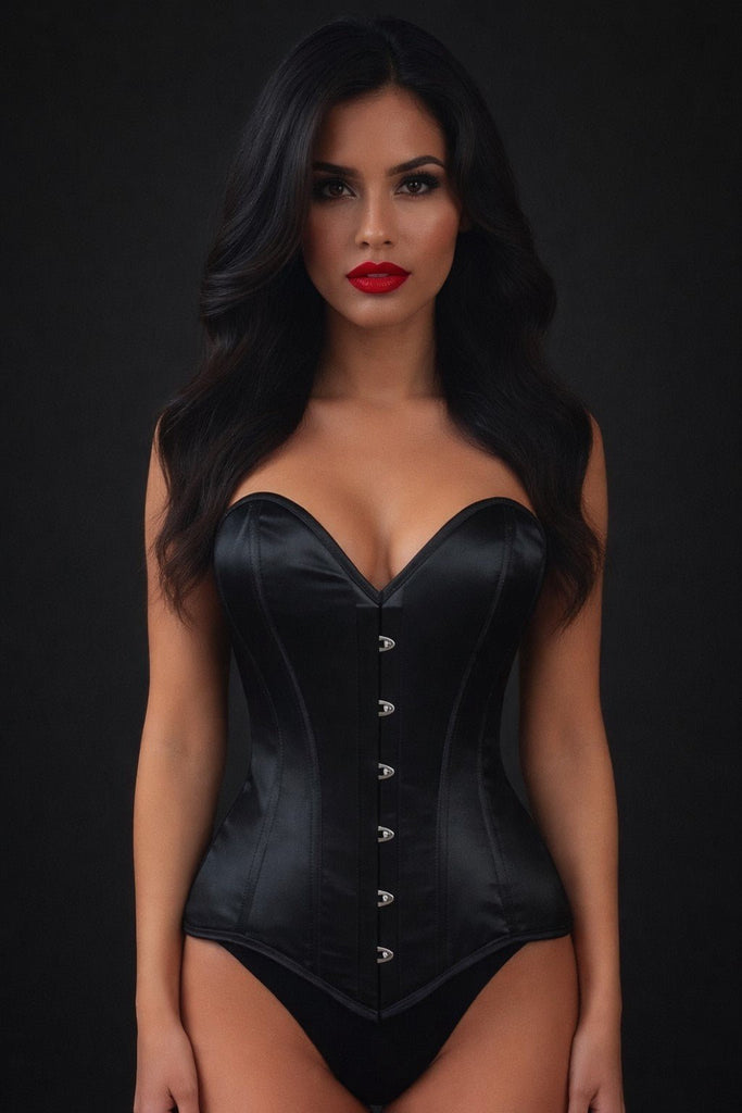 Lavish Black Satin Overbust Corset Sweetheart Neckline Busk Closure